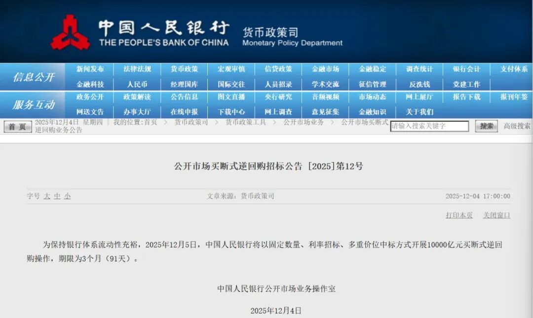 据央行公告,为保持银行体系流动性充裕,2025年12月5日,中国人民银行将以固定数量、利率招标、多重价位中标方式开展10000亿元买断式逆回购操作,期限为3个月(91天)。